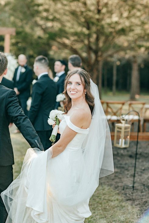 There’s something truly special about a wedding held at the bride’s family home! Morgan and Reid tied the knot on October 15th, 2022, in an elegant backyard wedding at her family’s home in Georgia. Set amongst the tall Georgia Pine Trees, the land was the perfect location host to their elegant backyard wedding. From the all-white bouquet filled with white roses and white hydrangeas to the Groom and Groomsmen in black tuxedos, every moment of Morgan and Reids’s wedding day was perfectly executed (and picture-perfect)!